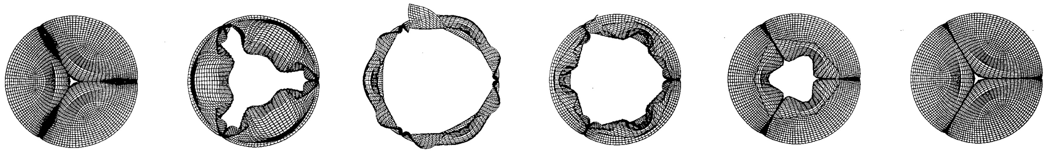 A couple of weeks ago I wrote about speaking to a workshop on the aorta and reminisced about research on cardiac dynamics from about 15 years ago. It triggered another memory of research we did more than 20 years ago on the tearing of the leaflets of artificial heart valves made from biological tissue. We developed a computational model of the stresses associated with a tear developing in a porcine bioprosthetic heart valve. The black and white images show snapshots of the predicted motion during the cardiac cycle of a damaged valve with a tear at about 11.30 along the edge of the top right leaflet. The valve was simulated as being implanted to replace the aortic valve and the view is from the aorta, i.e., looking in the opposite direction to the blood flow out of the heart. The tear causes part of the leaflet to flap outwards as can be seen in the middle snapshots. The colour image shows the distribution of stress in the leaflet corresponding to the last snapshot of the motion and the concentration of stress around the tip of the tear can be seen which will tend to cause the leaflet to tear further leading to a bigger flap, more regurgitation of blood. We were really excited about this research when we published it in 1999 but it has attracted relatively little attention in the last 23 years. I would like to think that we were far ahead of our times but that’s unlikely and probably it was not as exciting as we thought, maybe because it lacked clinical relevance, our model lacked credibility or not many people have found our paper.