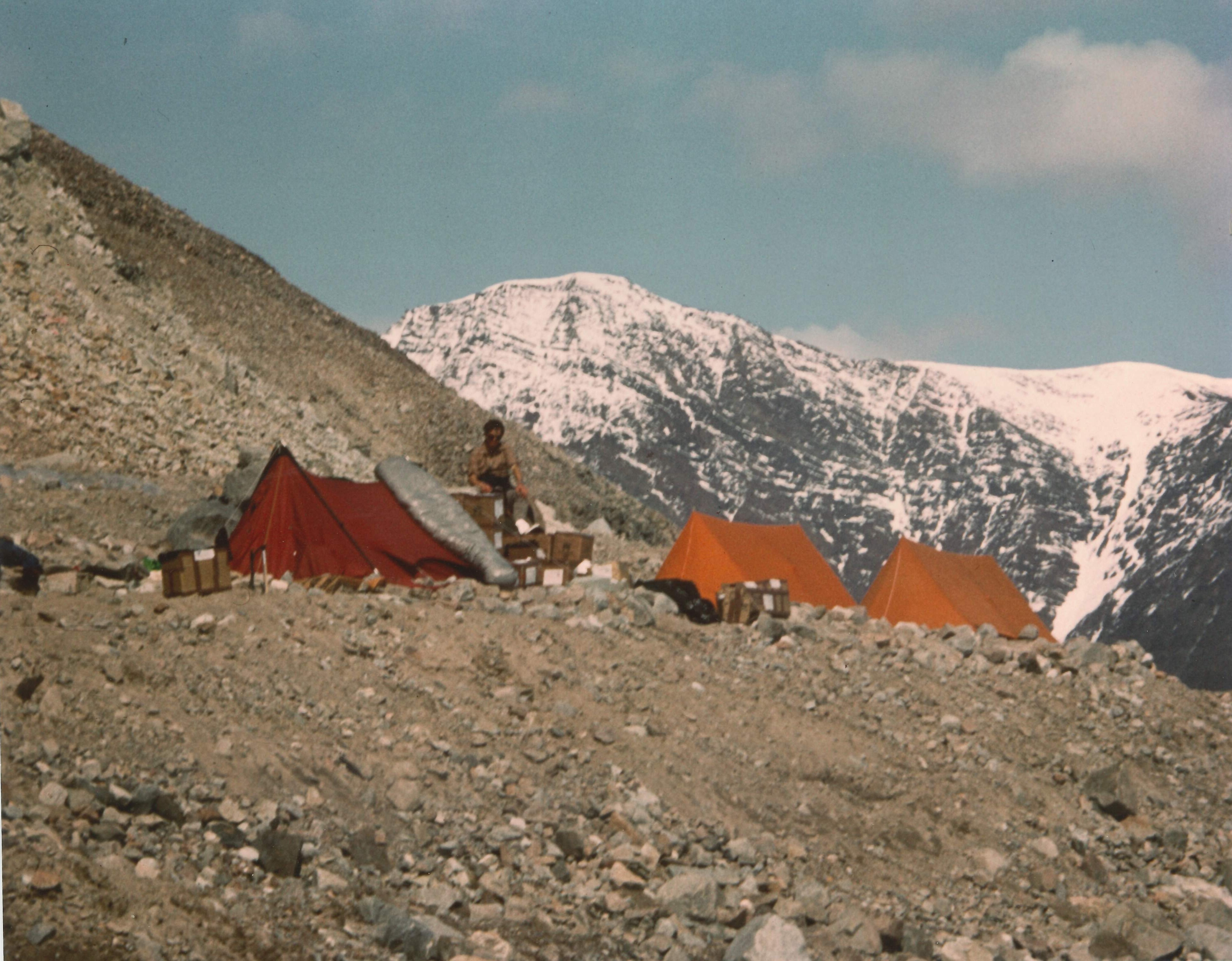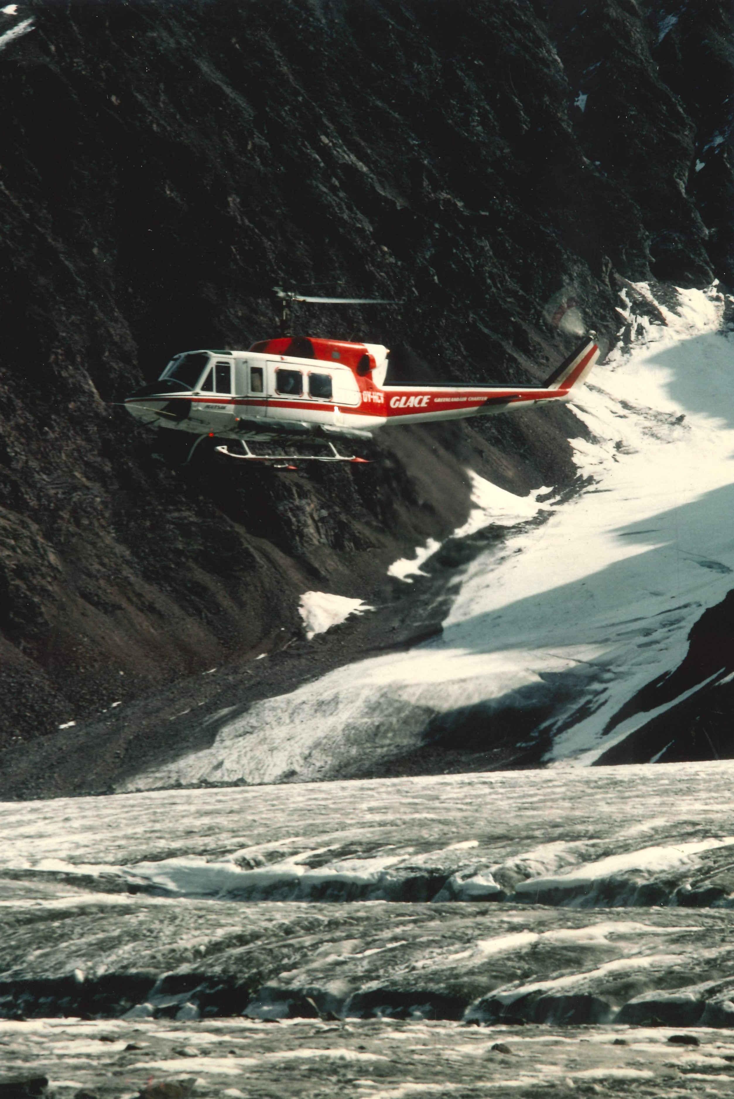 Images: helicopter over Bersaerkerbrae glacier after delivering supplies to base camp (top) and base camp on the western lateral moraine of the Bersaerkerbrae glacier (right). We never got close enough to a polar bear for a good photograph.