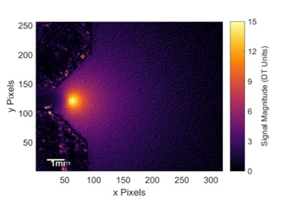 Amplitude of temperature in steel due to a cyclic load with a crack growing from left to right along the horizontal centre line with the stress concentration at its tip exhibiting the peak values. The wedge shapes in the left corners are part of the system.