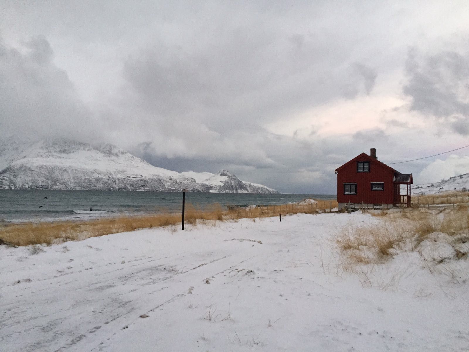 Decorative photograph showing a small red house in the snow next to a fjord.