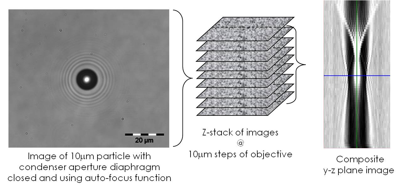 Image of 3nm diameter gold particle in a conventional optical microscope (top right), in a nanoscope (bottom right) and composite images in the z-direction of the caustic formed in the nanoscope (left).