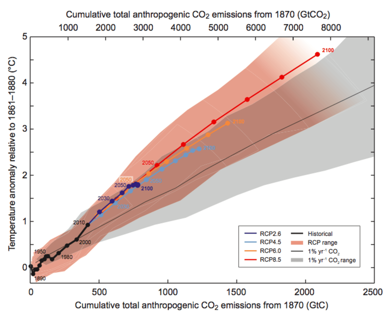 Figure 1. Time series of global mean sea level (deviation from the 1980-1999 mean) in the past and as projected for the future. For the period before 1870, global measurements of sea level are not available. The grey shading shows the uncertainty in the estimated long-term rate of sea level change. The red line is a reconstruction of global mean sea level from tide gauges, and the red shading denotes the range of variations from a smooth curve. The green line shows global mean sea level observed from satellite altimetry. The blue shading represents the range of model projections for the SRES A1B scenario for the 21st century, relative to the 1980 to 1999 mean, and has been calculated independently from the observations. Beyond 2100, the projections are increasingly dependent on the emissions scenario. Over many centuries or millennia, sea level could rise by several metres. From https://archive.ipcc.ch/publications_and_data/ar4/wg1/en/faq-5-1-figure-1.html